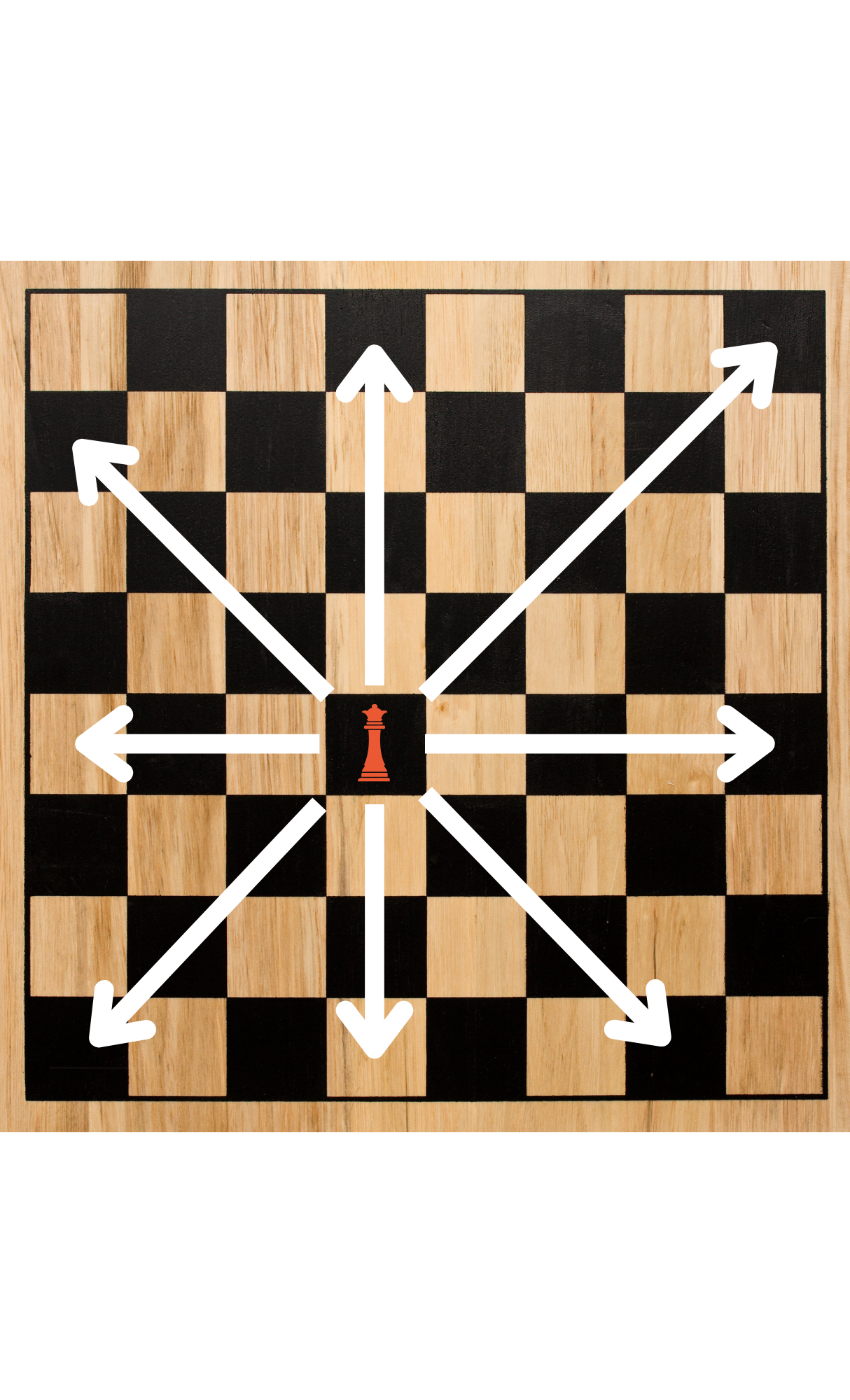 The Queen is a strong long-range piece and moves like both a Bishop and Rook combined. Because of this, they can move forward, backward, left, right, and along their diagonals, so long as not blocked- they can’t jump over pieces.