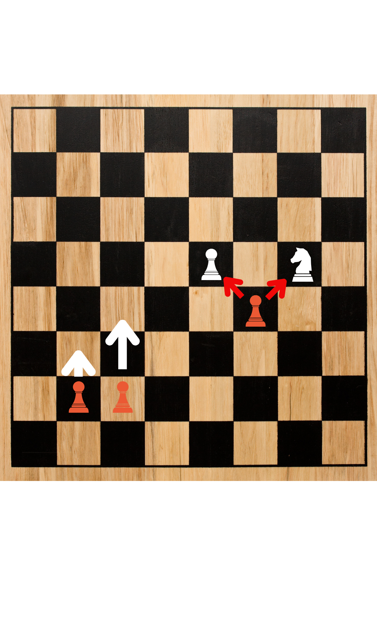 Pawns do well when they support each other (called pawn chains). Because they attack one square forward diagonally in both directions, you can line up pawns so they defend one another, making a wall that can’t be broken easily.