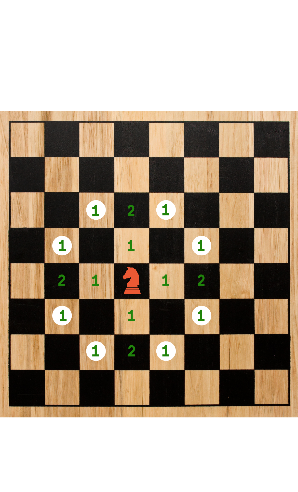 Knights are mid-range pieces that move “over two, over one”. Starting from a vertical or horizontal square around the Knight, count two squares up, down, left, or right. Then adjacent one square.