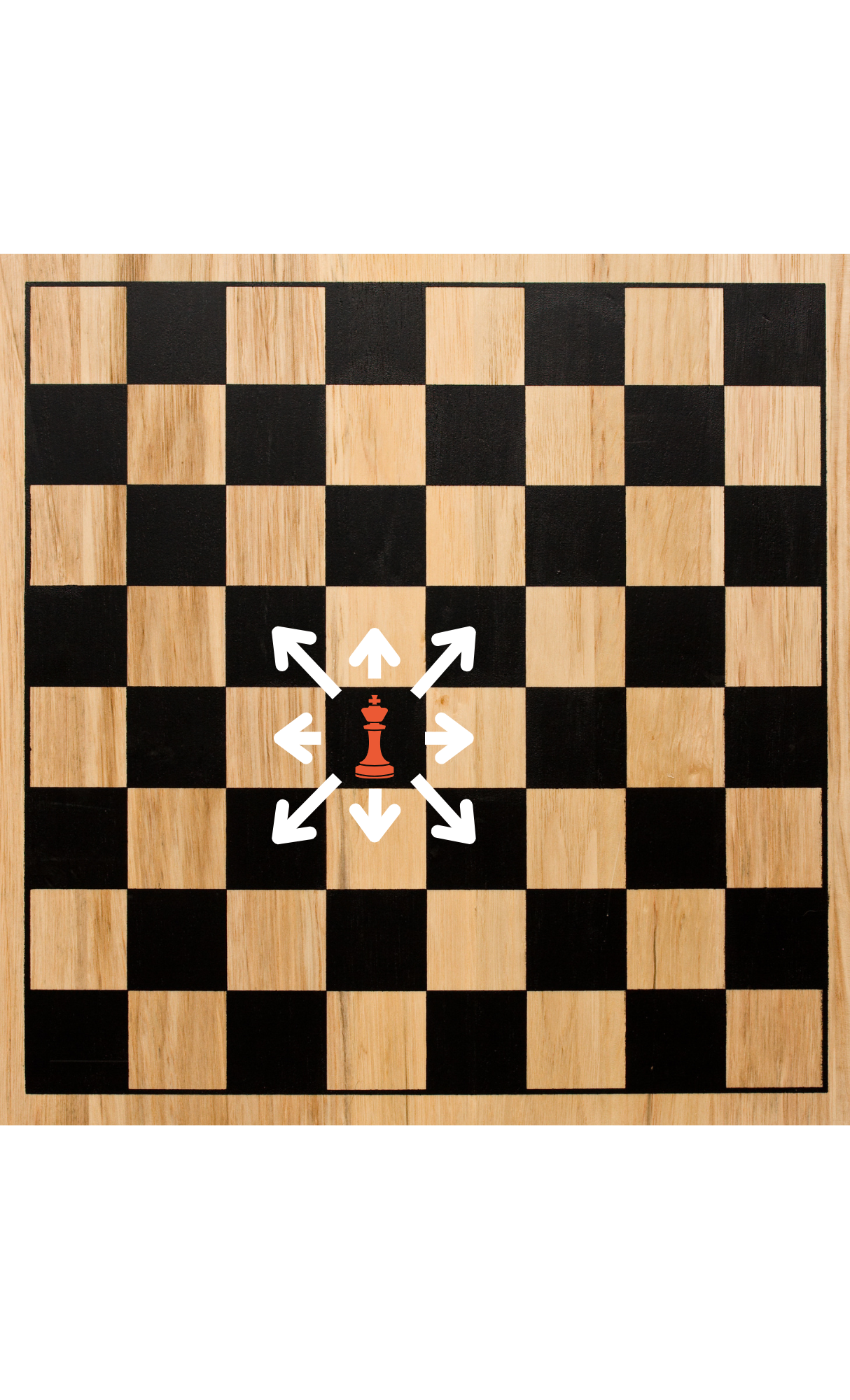 Your King is a short-range piece that’s able to move one square in any direction, so long as not blocked by its own color pieces.